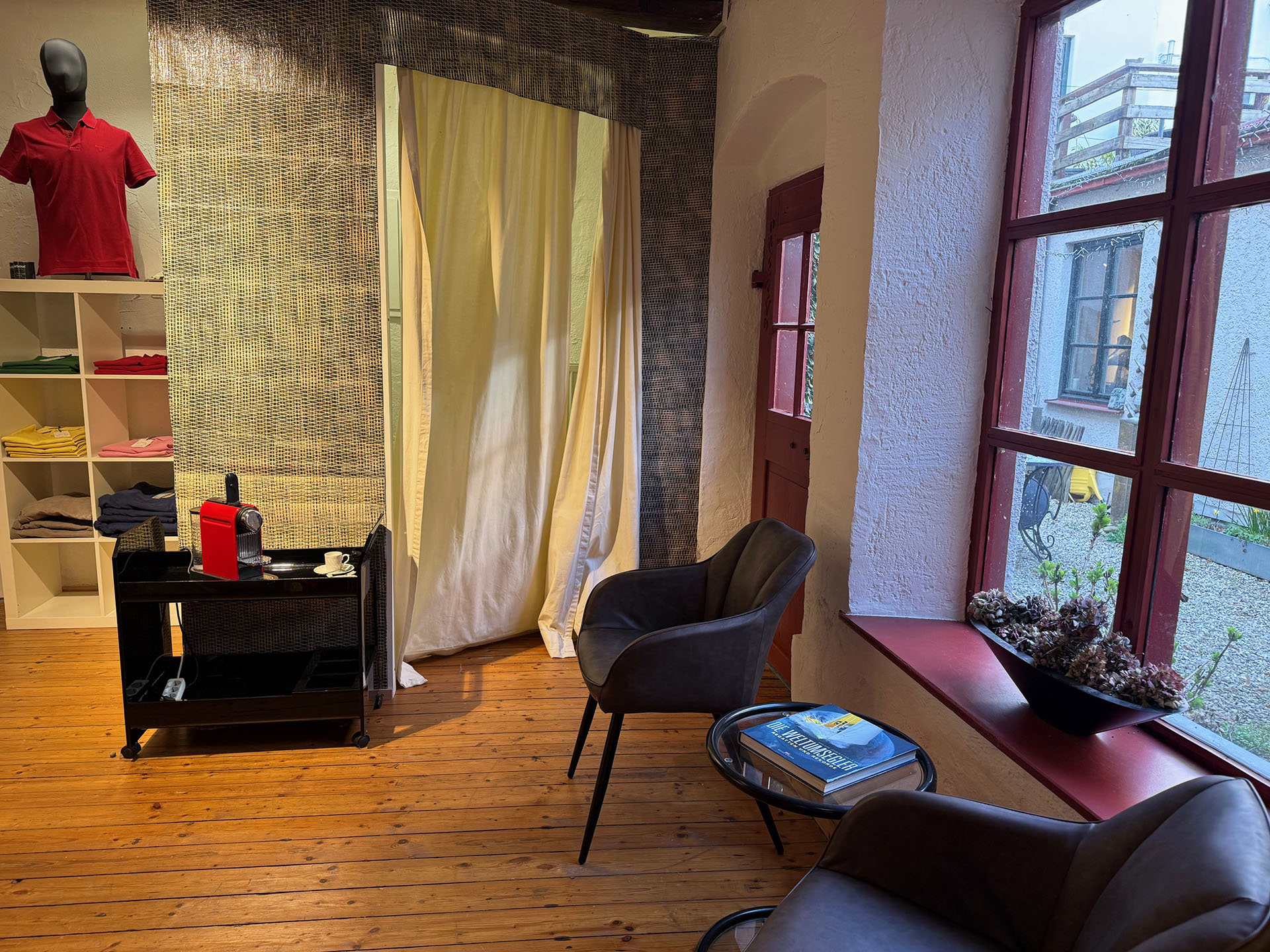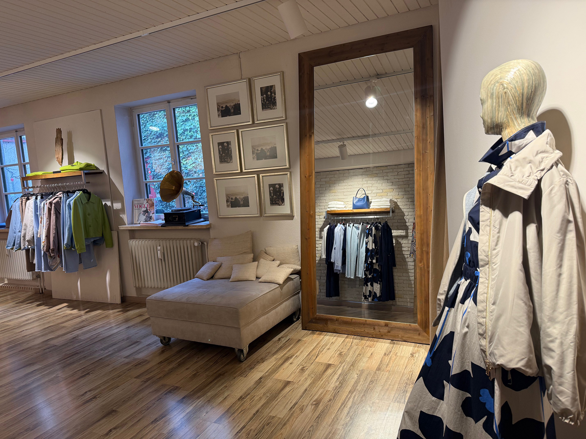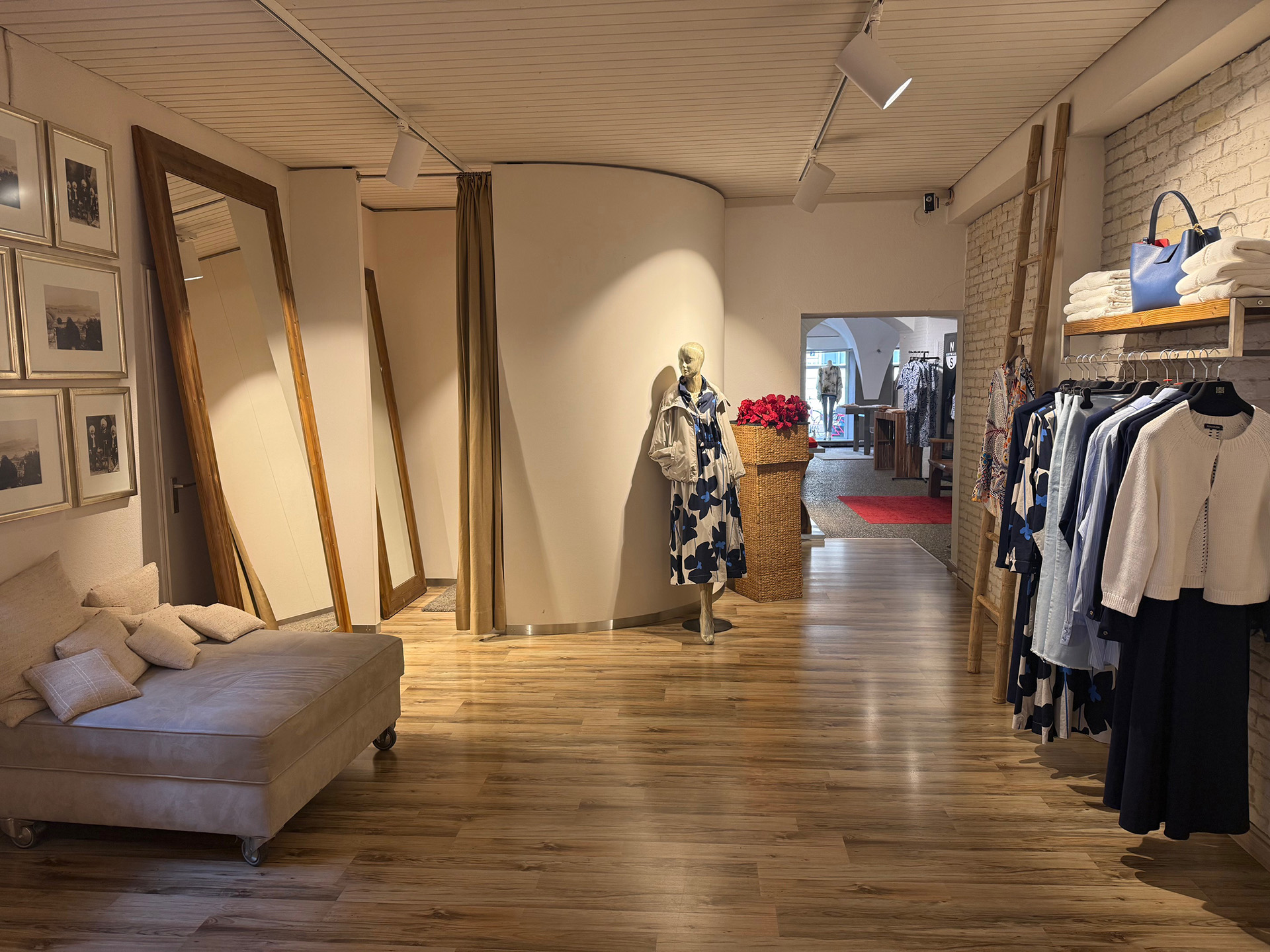 Was von außen zunächst charmant und fast ein wenig überschaubar wirkt, entfaltet sich beim Durchschlendern zu einer echten Einkaufswelt mit sieben liebevoll gestalteten Räumen, immer neue Nischen und Perspektiven. Eine geschmackvolle Auswahl an Kleidung, Schuhen und Accessoires in gehobener Qualität – erschwinglich und jeden Cent wert.